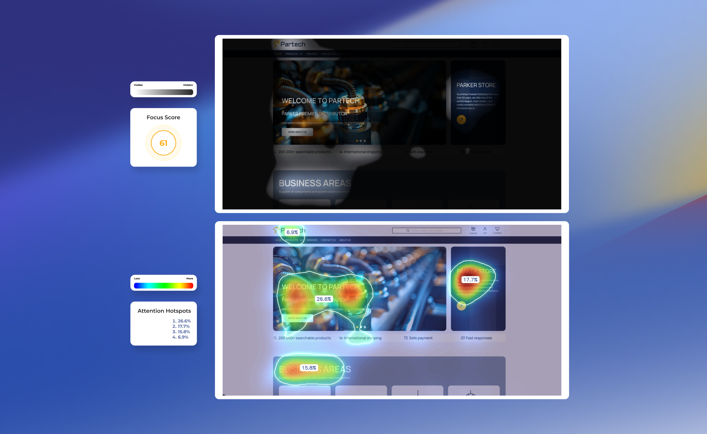 A second attention heatmap test showed a higher focus score and clearer attention distribution, indicating a stronger visual hierarchy and better alignment between user attention and business priorities.